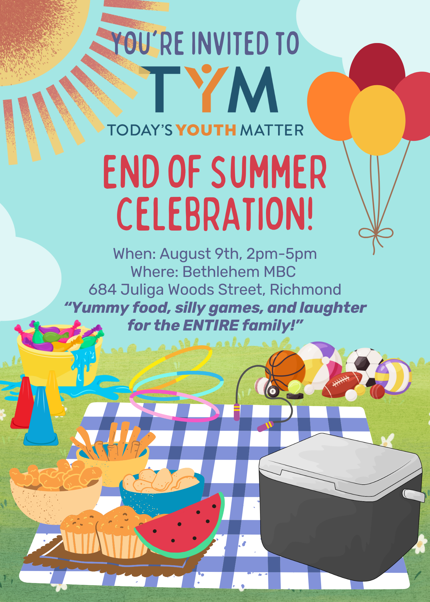 A fabulous event for the entire family! Before school starts, let's gather for an afternoon of Food, Fun and TYM Family. This gathering will also be a fun "reunion" for all campers and leaders from summer camp! :- ) Whether you are a family or leader, please select the number of children/youth as well as adults planning to attend from your household. This will help us make sure we have enough food for all and a special gift for each school age child who particiapted in our Spring & Summer Session. :- )